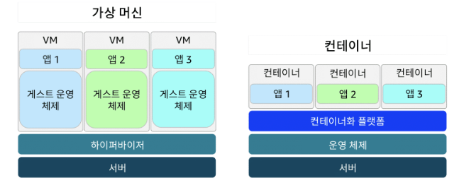 컨테이너는 호스트 컴퓨터의 운영체제 공유하므로 vm보다 빠르고 가벼움